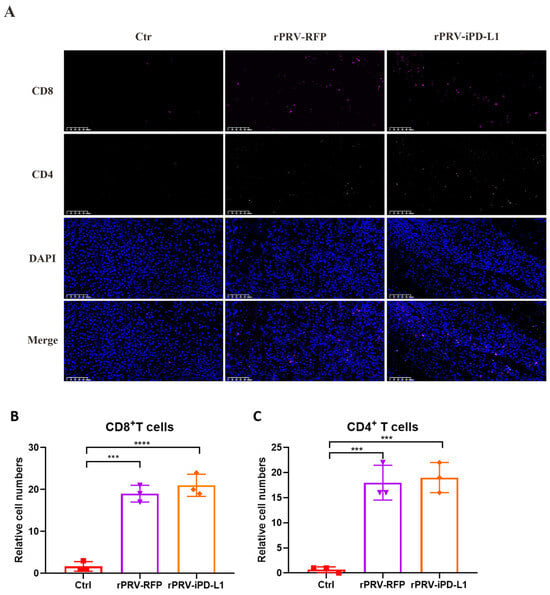 We further stained CD4+ and CD8+ T cells in the tumor microenvironment of different groups of mice. Immunofluorescence analysis demonstrated a significantly elevated presence of CD4+ and CD8+ T cells in the tumor tissues of mice treated with rPRV-iPD-L1 and rPRV-RFP (Figure 6A–C). These results suggest that PRV treatment increases the infiltration of the CD4+ and CD8+ T cells in the tumor microenvironment.