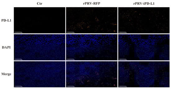 To explore the potential mechanism behind the enhanced anti-tumor activity of rPRV-iPD-L1 compared to rPRV-RFP, we immunostained PD-L1 as it has been reported that oncolytic virus treatment induces upregulation of PD-L1 in tumor cells. Indeed, immunofluorescence analysis showed that the expression of PD-L1 in tumor areas in rPRV-RFP- and rPRV-iPD-L1-treated mice were much higher than that in the control group (Figure 7). PRV-induced upregulation of PD-L1 in tumor microenvironments may hamper T-cell-mediated killing of tumor cells, and the expression of iPD-L1 may counteract this inhibition, explaining the enhanced anti-tumor activity of rPRV-iPD-L1.