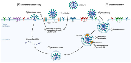 The expanded entry pathways of SARS-CoV-2. The S-protein of SARS-CoV-2 binds to its primary receptor, ACE2, or potentially to Basigin (step 1), which induces conformational changes in the S1 subunit and exposes the S2 site for cleavage. The S-protein can bind to NRP1 and DPP4, enabling membrane fusion. Depending on the entry pathway taken by SARS-CoV-2, the S2 site is cleaved by either TMPRSS2 or ADAM 10/17 (membrane fusion entry, part A) or Cathepsins B/L (receptor-mediated endosomal entry, part B). In the presence of proteases on the plasma membrane, S-protein cleavage occurs at the cell surface (part A, step 2). With endosomal entry, the S-protein-receptor complex is internalized via clathrin-mediated endocytosis (part B, step 2) into endolysosomes, where the S2 site is cleaved by Cathepsins B/L (part B, step 4). Before this, the cleavage via cathepsins requires an acidic environment for its activity; therefore, endosomal acidification occurs (part B, step 3). Fusion between the virus and host cellular membranes forms a fusion pore where viral RNA is released into the host cytoplasm for viral uncoating and replication. Adapted from Jackson et al. [79]. Created in BioRender.com.