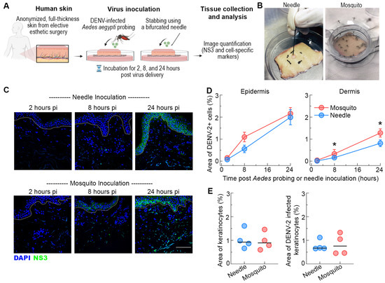 Similar infection in the epidermis but enhanced infection in dermis following Ae. aegypti inoculation of DENV-2. (A) Schematic representation of the experimental approach. (B) Images of skin explants inoculated via probing by puncturing using a bifurcated needle or by DENV-2-infected Ae. aegypti mosquitoes. (C) Representative images showing NS3 expression (green) at 2, 8, and 24 h after needle or mosquito inoculation in human skin. Blue staining in images represents nuclei and the dotted lines indicate the epidermal-dermal junction. Scale bar 50 μm. (D) Quantification of DENV-2 infection in the epidermis and dermis. Data are expressed as the area of NS3-positive cells as a percentage of the total imaged skin. Data are from 4 skin donors and expressed as mean ± SEM. * p < 0.05 (Mann–Whitney U test) comparing mosquito versus needle at each time point. (E) Quantification of the area of epidermal keratinocytes (AE1+) and area of infected keratinocytes (AE1+NS3+) in the skin after DENV-2 inoculation by needle or mosquito in human skin. Each symbol is an individual donor, and the horizontal line is the median.