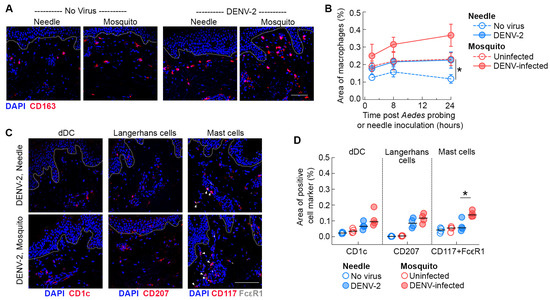 Ae. aegypti probing increases the recruitment of resident myeloid cells in the dermis of skin inoculated with DENV-2. (A) Immunofluorescence of skin stained with antibodies against CD163 (macrophages, red) 24 h after needle or mosquito inoculation of DENV-2 in human skin. Blue staining represents nuclei and dotted lines indicate epidermal–dermal junction. Scale bar 50 μm. (B) Quantification of the density of macrophages in mock-infected skin (open symbols) and infected skin (closed symbols) over time. Data are from 4 skin donors expressed as mean ± SEM. * p < 0.05 (Mann–Whitney U test) comparing uninfected mosquito versus mock-needle at 24 h. (C) Immunofluorescence of skin stained with antibodies against CD1c (dermal DCs, red), CD207 (Langerhans cells, red), and CD117 and FcεR (mast cells, red and white) 24 h after needle or mosquito inoculation of DENV-2 in human skin. Blue staining represents nuclei and dotted lines indicate epidermal–dermal junction. Arrowheads indicate double staining for CD117 and FcεR in mast cells. Scale bar 50 μm. (D) Quantification of the density of dermal dendritic cells, Langerhans cells, and mast cells at 24 h under different conditions. Each symbol is an individual donor, and the horizontal line is the median. * p < 0.05 (Mann–Whitney U test) comparing DENV-2 infected mosquito versus needle.
