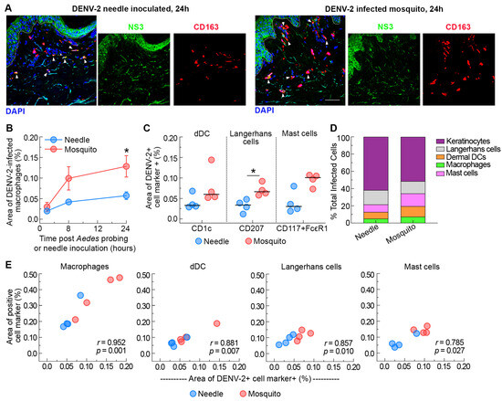 We next examined the contribution of mosquito probing to the infection of myeloid cells with DENV-2. We found that Ae. aegypti probing increased the density of infected macrophages 2- to 3-fold at 8 and 24 h post-infection, respectively, relative to needle-inoculated skin (Figure 3A,B). Quantitative image analysis revealed that ~35% of the macrophages were DENV-2-positive in the Ae. aegypti-inoculated skin compared to 25% in the needle-inoculated skin (p = 0.028) at 24 h post-infection. In addition, there was a 2-fold increase in the density of infected dermal DCs and Langerhans cells relative to needle-inoculated skin at 24 h post-infection (Figure 3C). Of note, the increased recruitment of infected Langerhans cells to the dermis following mosquito probing observed at 24 h post-inoculation likely explains the transient differences in the overall density of infected cells in the epidermal layer in mosquito- versus needle-inoculated skin (Figure 1D). A previous report showed productive infection of mast cells when DENV-infected Ae. aegypti were allowed to feed on biopsy punches of human skin tissues [22]. We confirm and expand this finding by showing that Ae. aegypti probing significantly enhances the density of DENV-2 infected mast cells within the dermis of mosquitoes relative to needle-inoculated skin (Figure 3C). We also found a strong positive relationship between the recruitment of macrophages, dermal dendritic cells, Langerhans cells, and mast cells and their infection with DENV-2 (Figure 3E). In addition, myeloid cells made up roughly 50% of all DENV-infected cells at 24 h post-infection by Ae. aegypti probing, while in needle-inoculated skin around 40% of the infected cells were myeloid cells at the same time point (Figure 3D). Collectively, our data suggests that Ae. aegypti mosquito probing increases local recruitment of virus-susceptible myeloid cells to the foci of infection, even without an intact blood supply to the skin.