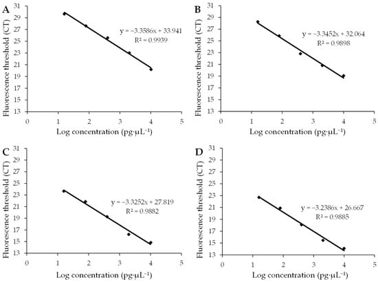 cDNA from the AMV and WCMV co-infection of N. benthamiana was used as a standard [20], and it was subjected to 5× gradient dilutions at concentrations of 10 ng·μL−1, 2 ng·μL−1, 0.4 ng·μL−1, 0.080 ng·μL−1, and 0.016 ng·μL−1, respectively. The primer sequences for amplification, the reaction system, and the amplification procedure are shown in the previous section, and finally, the standard curves for qPCR of the target and internal reference genes were made. The amplification efficiencies (E) of AMV CP, WCMV CP, 25S rRNA, and β-Actin genes were calculated, and the relative accumulation of AMV CP and WCMV CP genes was calculated using the 2−ΔΔCt method.