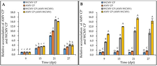Relative accumulation of AMV CP and WCMV CP in N. benthamiana after AMV and WCMV co-infection. WCMV CP, relative accumulation of WCMV CP of WCMV single infection. AMV CP, relative accumulation of AMV CP of AMV single infection. WCMV CP (AMV:WCMV), relative accumulation of WCMV CP of AMV and WCMV co-infection. AMV CP (AMV:WCMV), relative accumulation of AMV CP of AMV and WCMV co-infection. (A) The 9 dpi samples were normalized to 1.0 for each treatment. The relative accumulation of AMV CP and WCMV CP at 15 dpi, 21 dpi, and 27 dpi was calculated. The different lowercase letters indicate significant differences at the 0.05 level between AMV and WCMV co-infections and AMV or WCMV single infections at different times in the same treatment. (B) The WCMV single-infection samples were normalized to 1.0 each time (dpi). The relative accumulation of AMV CP and WCMV CP (AMV:WCMV) at 9 dpi, 15 dpi, 21 dpi, and 27 dpi was calculated. The different capital letters indicate significant differences at the 0.01 level between AMV and WCMV co-infection and AMV or WCMV single infection at different treatments at the same time.