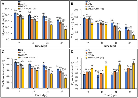 Changes in photosynthetic pigment content of N. benthamiana after AMV and WCMV co-infection. (A) The changes in Ch1a content in N. benthamiana. (B) The changes in Ch1b content in N. benthamiana. (C) The changes in T-Ch1 content in N. benthamiana. (D) The changes in Car content in N. benthamiana. The different capital letters indicate significant differences at the 0.01 level between AMV and WCMV co-infection and AMV or WCMV single infection in different treatments at the same time, and the different lowercase letters indicate significant differences at the 0.05 level between AMV and WCMV co-infection and AMV or WCMV single infection at different times in the same treatments.