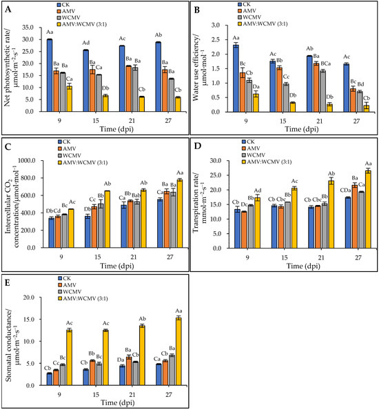 Effect on parameters for gas exchange in the photosynthesis of N. benthamiana leaves after AMV and WCMV co-infection. (A) Net photosynthetic rate (Pn). (B) Water use efficiency (WUE). (C) Intercellular CO2 concentration (Ci). (D) Transpiration rate (Tr). (E) Stomatal conductance (Gs). The different capital letters indicate significant differences at the 0.01 level between AMV and WCMV co-infection and AMV or WCMV single infection in different treatments at the same time, and the different lowercase letters indicate significant differences at the 0.05 level between AMV and WCMV co-infection and AMV or WCMV single infection at different times in the same treatments.