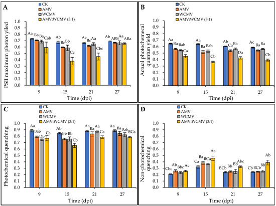 Dynamics of chlorophyll fluorescence parameters in N. benthamiana after AMV and WCMV co-infection. (A) PSII maximum photon yield (Fv/Fm). (B) Actual photochemical quantum yield (ΦPSII). (C) Photochemical quenching (qP). (D) Non-photochemical quenching (qN). The different capital letters indicate significant differences at the 0.01 level between AMV and WCMV co-infection and AMV or WCMV single infection in different treatments at the same time, and the different lowercase letters indicate significant differences at the 0.05 level between AMV and WCMV co-infection and AMV or WCMV single infection at different times in the same treatments.