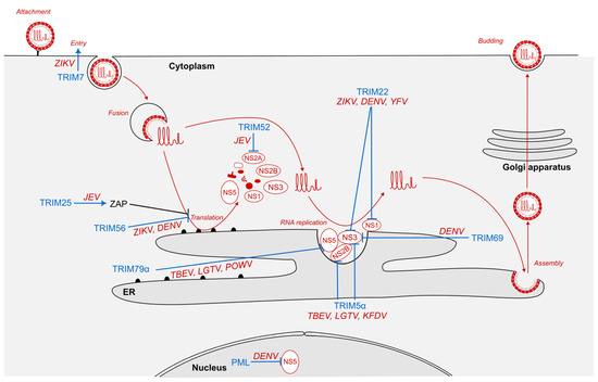 TRIM proteins are, therefore, able to block flaviviruses replication at different steps of their cycle (Figure 1). Yet, some flaviviruses have evolved mechanisms to counteract TRIM protein-mediated restriction, or even to take advantage of TRIM protein activities to enhance replication. Nevertheless, TRIM proteins do not always act directly on viral components, but are also part of a broader antiviral response against flaviviruses.