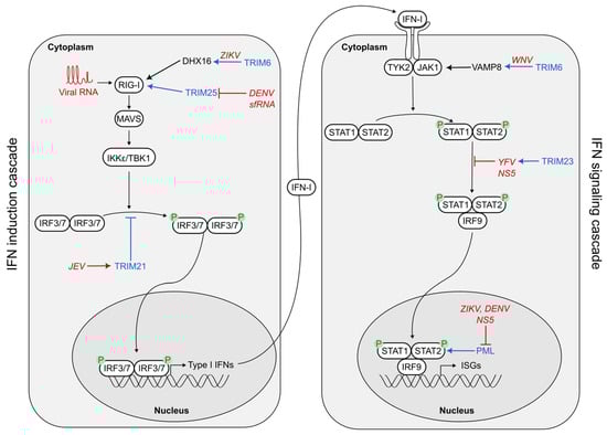 Modulation of type I interferon response by TRIM proteins upon flavivirus infection. Upon its activation by viral RNA, RIG-I interacts with the downstream adaptor MAVS, which in turn recruits TANK-binding kinase 1 (TBK1) and IκB kinase-ε (IKKε), leading to the phosphorylation of interferon Regulatory Factor 3 and/or 7 (IRF3/7). Once phosphorylated, IRF3/7 dimerize and translocate into the nucleus to induce the expression of IFN-I. Once secreted, IFN-I binds to its receptor, leading to the activation of the Jak tyrosine kinases Tyk2 and JAK1, which in turn phosphorylate STAT1 and STAT2. Phosphorylated STATs heterodimerize and associate with IFN regulatory factor 9 (IRF9), to form a complex known as IFN-stimulated growth factor 3 (ISGF3). Once this complex translocates into the nucleus, it induces the expression of hundreds of interferon-stimulated genes (ISGs). Cellular and viral proteins that interfere with the type I IFN response are indicated in blue and red, respectively. IFN, interferon; ZIKV, Zika virus; JEV, Japanese encephalitis virus; DENV, dengue virus; WNV, West Nile virus.