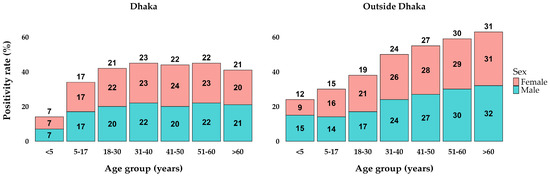 The analysis of positivity rates by age and sex groups in Dhaka and outside Dhaka reveals notable trends. In Dhaka, the positivity rates start at 7% in the <5 years age group, increase to 17% in the 5–17 years age group, and reach their peak at 23% in the 31–40 years age group. Subsequently, the rates stabilize around 22% for the 41–50 and 51–60 years age groups, before slightly decreasing to 21% in those over 60 years old. The rates were relatively similar between sexes within each age group, showing minimal differences (Figure 2). Outside Dhaka, the positivity rates were consistently higher across all age groups compared to Dhaka. The rates begin at 12% for the <5 years age group, rise to 15% in the 5–17 years age group, and continue to increase, reaching 19% in the 18–30 years age group. The positivity rate peaks at 31% in those over 60 years old. Both locations exhibit an upward trend in positivity rates with increasing age, with outside Dhaka showing a more pronounced rise.
