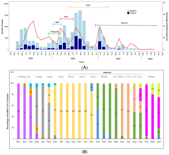 Moving on to 2022, we observed two peaks. The highest peak was observed in January (n = 3600), followed by February (n = 1148). Positivity rates were significantly lower in the other months, except in June, when 289 positive cases were reported (Figure 3A). In terms of variant analysis, the Omicron variant was circulated throughout the year with various lineages. In February BA.1 and BA.2 were in circulation with 54% and 46%, respectively. From March to May, BA.2 was dominantly (more than 90%) circulated. However, the positivity rate was lowest in 2023 over the years, and at the end of May 2023, XBB emerged, and all the variants identified following the month were XBB with different lineages, including BJ.1 + BM.1.1.1 + FL.5 + GJ.1 + GE.1 (Figure 3B).