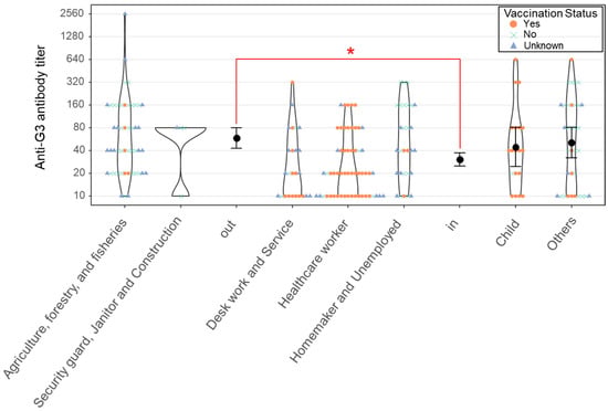 The violin and bee swarm plots in the graph show the distribution of antibody titers for each occupational category. The participants were divided into three groups based on their vaccination status: vaccinated individuals are represented by orange circles, unvaccinated individuals by aqua blue crosses, and those with unknown vaccination status by blue triangles. The geometric mean titers are represented by black dots, and their confidence intervals are indicated by the error bars around them. The occupational groups categorized under “out” include the two leftmost categories, representing outdoor work settings, whereas the “in” category includes the three central groups, representing indoor work environments. Welch’s t-test was used to compare the antibody levels between the indoor and outdoor groups, and p < 0.005 is indicated by a red asterisk.