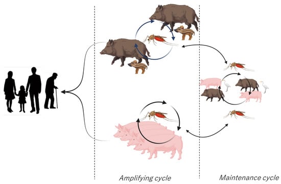 Schematic model presenting the amplifying cycles of JEV in the classic natural situation (bottom) [42,43] and on Tsushima Island (top). The content of wild boar piglets was imported from Freepik [44] and created using BioRender.com [45].