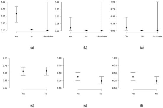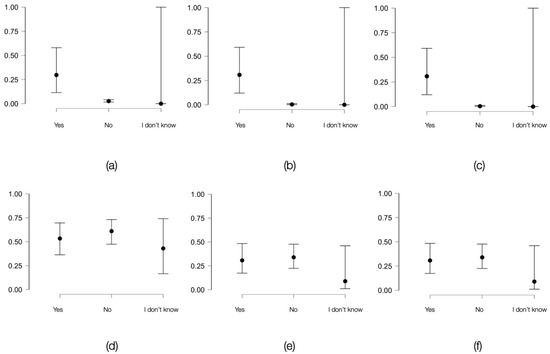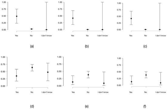 Variation in the probability of obtaining positive HIV and HCV screening tests or the presence of HIV-HCV coinfection based on the presence of the risk factor (sharing injection materials such as syringes and needles within the last 12 months) among individuals in the general population and in the inmate population: (a) graphical representation of how the probability of a positive HIV screening test varies based on the presence or absence of the risk factor among individuals of the same age in the general population; (b) HCV in the general population; (c) HIV-HCV coinfection in the general population; (d) graphical representation of how the probability of a positive HIV screening test varies based on the presence or absence of the risk factor among individuals of the same age in the inmate population; (e) HCV in the inmate population; (f) HIV-HCV coinfection in the inmate population.