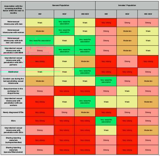In the general population, this risk factor was strongly associated with HCV (Cramer’s V coefficient = 0.41, p < 0.001) and HIV-HCV coinfection (Cramer’s V coefficient = 0.41, p < 0.001), and moderately associated with HIV (Cramer’s V coefficient = 0.2, p < 0.001). In contrast, among incarcerated individuals, the association was very strong only in the case of HCV (Cramer’s V coefficient = 0.37, p < 0.05).