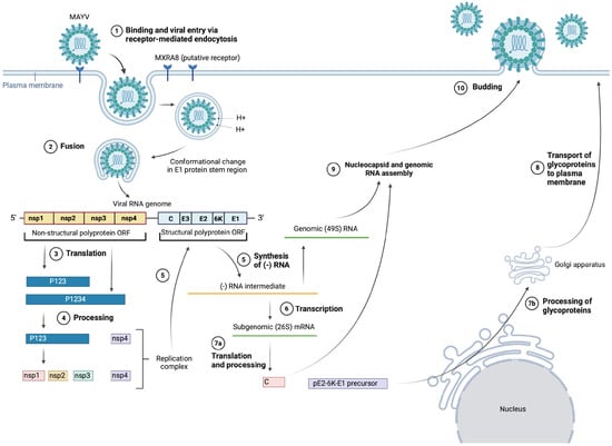 MAYV entry, replication, assembly and budding. (Created with BioRender.com).