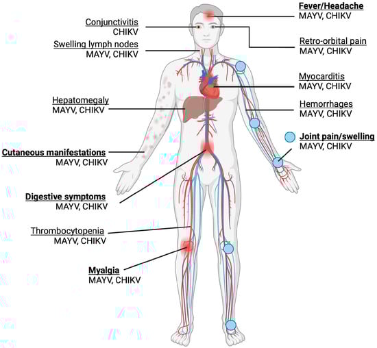 MAYV infection generally presents as a mild, self-limited and non-specific febrile illness, sharing significant overlap with the presentation of CHIKV and DENV [9]. Common symptoms include an abrupt fever, which can last 10 days, myalgia, arthralgia, maculopapular rash, fever, headache and diarrhoea, as shown in Figure 3 [55]. Although most MAYV cases are mild, severe complications such as myocarditis and haemorrhagic and neurological manifestations may also occur [9]. Similar to other arthritogenic alphaviruses such as CHIKV, the possibility of developing chronic, severe polyarthralgia makes MAYV infection potentially debilitating, despite no fatalities having been recorded at present, raising significant clinical concern. Among infected patients, an estimated 50–89% and 75% experience arthralgia and myalgia, respectively [56]. MAYV-induced arthralgia and myalgia could persist for a few months to years, with up to 54% of patients experiencing chronic arthralgia at a 12-month follow-up after acute infection [57]. Mainly, the joints affected are those of the hand (63%), knee (38%), wrist (25%), ankle and foot (25%), elbow (13%) and shoulder (7%) [56].