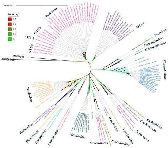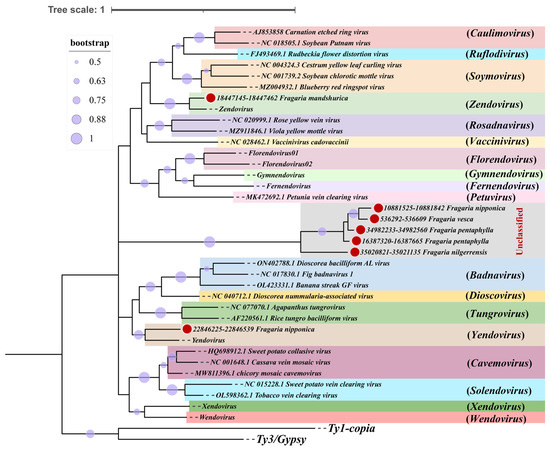 The phylogenetic relationship of strawberry pararetroviral RT homologs within the Caulimoviridae family, as retrieved from a homology search. The maximum likelihood tree was constructed using representative sequences derived from strawberry genomes and 11 genera of exogenous viral species within the Caulimoviridae family (per ICTV classification), along with RT sequences from 7 endogenous viral genera. The phylogenetic analysis was bootstrapped 500 times, and the confidence level of the branch was indicated by the color of the branch. The 11 exogenous viral genera (ICTV) include: Caulimovirus, Rosadnavirus, Petuvirus, Dioscovirus, Badnavirus, Vaccinivirus, Soymovirus, Tungrovirus, Ruflodivirus, Cavemovirus, and Solendovirus. The 7 endogenous viral genera comprise: Florendovirus, Gymnendovirus, Fernendovirus, Yendovirus, Zendovirus, Xendovirus, and Wendovirus. The Ty1-copia and Ty3/Gypsy retrotransposon were selected as outgroups, and the rooted tree constructed by phylogenetic analysis was shown in Supplementary Figure S1.
