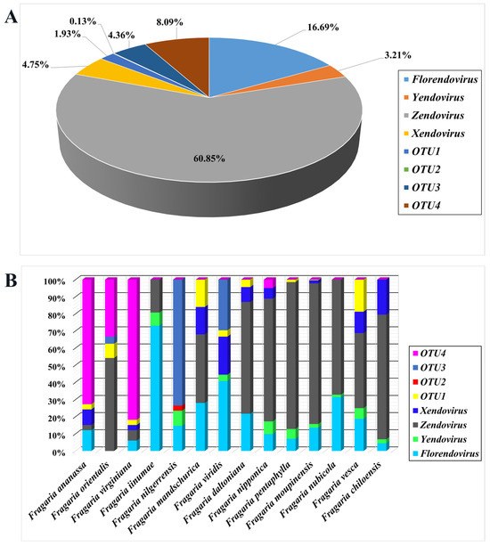 The EPRV sequences in strawberry genomes were statistically analyzed. The results indicated that the most abundant EPRVs belonged to Zendovirus, accounting for 60.85%, followed by Florendovirus, accounting for 16.69%. The smallest group was VOTU2, accounting for 0.13%, followed by VOTU1, accounting for 1.93% (Figure 2A). From different strawberry species, Zendovirus and Florendovirus are integrated into the genomes of almost all strawberry plants. Zendovirus is the main group integrated into the genomes of F. orientalis, F. mandschurica, F. daltoniana, F. nipponica, F. pentaphylla, F. moupinensis, F. nubicola, F. vesca, and F. chiloensis. Florendovirus is the main group integrated into the genomes of F. iinumae. Furthermore, the unclassified taxonomic group VOTU4 was identified as a predominant clade in the genomes of F. virginiana and cultivated strawberry F. × ananassa Duch. cv. Wongyo 3115 [60], while being present in the genomes of F. nipponica and F. orientalis. The unknown taxon VOTU3 is the main group integrated into the genome of F. nilgerrensis, and this group is also integrated into the genomes of F. viridis and F. orientalis. Notably, the unknown taxa VOTU2 is only found in the genome of F. nilgerrensis (Figure 2B).