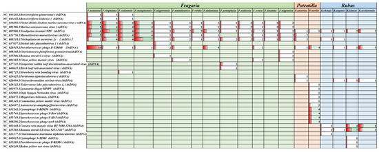 Genome alignment directly aligned the genomes of strawberries and other related plants to the NCBI viral genome database to identify virus-like sequences. In this study, the genomes of 14 Fragaria species, two Potentilla species, and four Rubus species were aligned with the NCBI viral genome database viral. 1.1. genomic.fna.gz (Index of/refseq/release/viral [nih.gov]), and sequences with at least 100 bp length and 70% similarity were considered as potential viral integration sequences. The results indicate that 15 different viral genome segments were found in 13 strawberry genomes (Figure 3). Among them, five virus-like fragments could be found in almost all strawberry plant genomes, including Finkel-Biskis-Jinkins murine sarcoma virus, Murine osteosarcoma virus, Neodiprion lecontei nucleopolyhedrovirus, and Trichoplusia ni ascovirus 2c. Prochlorococcus phage P-TIM 68-like sequences were also found in the genomes of eight strawberry species. Sequences similar to Cotesia glomerata bracovirus and Glyptapanteles indiensis bracovirus were found in the genomes of F. ananassa Duch. cv. Wongyo 3115, F. chiloensis, and F. virginiana. Sequences similar to Banana streak CA virus were present in the genome of F. nilgerrensis and F. nipponica. Sequences similar to Citrus yellow mosaic virus were found in the genomes of F. orientalis, F. nipponica, and F. vesca. In addition, some viral genome sequences could only be found in a specific strawberry genome, for example, Choristoneura fumiferana granulovirus only had similar fragments in the F. nipponica genome Dishui lake phycodnavirus 1. Similar sequences were only found in the F. nilgerrensis genome. Grapevine roditis leaf discoloration-associated virus (Caulimoviridae) only had similar fragments in the F. pentaphylla genome, and Birch leaf roll-associated virus (Caulimoviridae) only had similar fragments in the F. pentaphylla genome. This study also found fragments similar to the SVBV genome in the F. chiloensis genome, with 95% similarity and 267 bp alignment length. Notably, the complete genome of Escherichia phage phiX174 was assembled from the genome of F. orientalis (Supplementary Material S2 and Supplementary Figure S2).