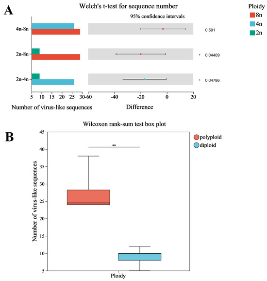 Welch’s t-test of endogenous virus-like sequences in different ploidy strawberry genomes (A); Wilcoxon rank-sum test analysis of endogenous virus-like sequences in the genomes of polyploid (octaploid and tetraploid) and lowploid (diploid) strawberries (B). The magnitude of the significance p-value was indicated by “*” (“*”, 0.01 < p < 0.05; “**”, 0.001 < p < 0.01).