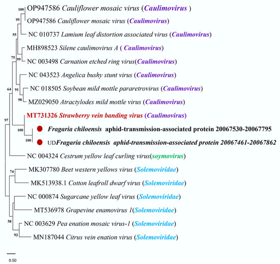 A segment of the aphid-transmission-associated protein sequence from SVBV was discovered in the F. chiloensis genome. SVBV belongs to the Caulimovirus genus of the Caulimoviridae family, it infects strawberries, and it can be transmitted by aphids. In this study, the region 20,067,530–20,067,795 on chromosome Fchil2-B2 of F. chiloensis shows 95% alignment similarity to the region 1133–1398 of the aphid-transmission-associated protein gene in the genome of SVBV. A phylogenetic analysis was conducted using the aphid-transmission-associated protein sequence belonging to Caulimoviridae viruses. The phylogenetic analysis results indicate that the aphid-transmission-associated protein-like sequence found in the F. chiloensis genome clustered with the aphid-transmission-associated protein sequence of SVBV, indicating that the similar sequence in the F. chiloensis genome represents an integrated sequence of the aphid-transmission-associated protein related to SVBV (Figure 6).