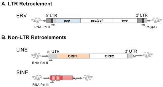 Retroelements comprise a major class of transposable elements (TEs) that are characterized by mobilization involving the reverse transcription of an RNA intermediate transcribed from an existing element [1]. Reverse transcription of the intermediate results in a dsDNA that is then reintroduced into the genome at a unique position along a chromosome by integration. As the original element is left intact, this process is commonly referred to as a ‘copy and paste’ mechanism of amplification. Retroelements are further classified based on the presence or absence of long terminal repeats (LTRs) and are referred to as LTR and non-LTR retroelements (Figure 1A and Figure 1B, respectively) [1]. Under canonical conditions, non-LTR element spread is restricted to the cell in which they are mobilized, whereas LTR retroelements originate from the germline infection of exogenous retroviruses, and therefore, their ability to spread involves leaving the cell [2]. To avoid negative effects that could arise if retroelements were expressed, host cells have evolved several mechanisms to tightly control their transcription [3]. The ability to control these elements permitted their functional exaptation or ‘repurposing’ within the host genome, and retroelements have been recently characterized for their use in regulatory networks, such as innate immunity and during embryogenesis [4,5]. However, the deregulation of TEs is commonly observed in cancers and other diseases and can negatively impact the expression of local genes or promote oncogenic effects through various mechanisms [6,7]. In this review, we focus on recent advances from studies of ERVs concerning their transcriptional regulation in health and disease.