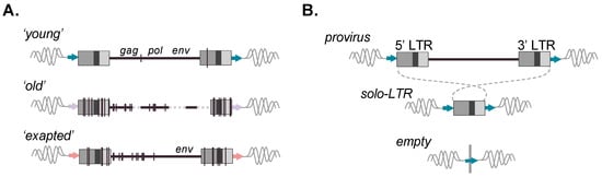 At the time of integration, a canonical full-length ERV retains the characteristic properties of a replication competent integrated provirus [12]. Structurally, the ERV is comprised of a long directly repeated sequence located at either terminus, together representing the LTRs (5′ LTR and 3′ LTR), that flank an internal segment, including protein-coding genes required for replication (Figure 1A). Minimally, these include gag, pro/pol, and env [14]. Briefly, gag encodes structural proteins; pro/pol the enzymatic functions, including protease, reverse transcriptase, and integrase; and env the envelope surface glycoprotein that mediates receptor recognition and membrane fusion [14]. The internal 5′ untranslated region (UTR) upstream of gag houses a primer binding site (PBS) of sequence that is complementary to the cellular tRNA used to prime reverse transcription. Once integrated, the LTRs provide regulatory functions for the transcription and processing of spliced, as well as full-length, mRNAs that will ultimately be used as templates for protein synthesis or incorporated into budding virions [14]. In the absence of selection, mutations accumulate randomly at the neutral rate of the host, one that is markedly slowed from its exogenous replication [15]. Thus, ERVs provide a fossilized record of once (or still) infectious retroviral lineages. The majority of ERVs are ancient and have lost the ability to leave the cell due to accumulated mutations resulting in their decay [15]. However, some are observed to maintain intact genes due to benefits offered to the host or remain transcriptionally regulated despite replication incompetence. Several species’ genomes harbor ERV lineages with evidence of recent or ongoing germline invasion, as inferred by the presence of new copies (Figure 2A). These ‘young’ ERVs tend to bear close sequence homology to their exogenous source and may retain transcriptional activities or possess one or more open reading frames (ORFs). Recent studies have drawn attention to such lineages in felines [16,17], wolf-like canids [18,19], mule deer [20,21], bovines [22], and koalas [23,24,25].