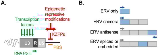 All retroviral LTRs, and, hence, those sourced from an ERV, possess a modular structure of unique segments U3 and U5 that are separated by a repeat segment R (5′ U3–R–U5 3′) (Figure 3A). Within these segments are regulatory cis-acting sequences corresponding to transcription factor (TF) binding sites (TFBSs) and the RNA Pol II TATA-box-like core promoter (usually in the U3) and a polyadenylation signal (usually in the R) [87]. Of note, the presence, placement, and sequence of these motifs can vary widely across ERV lineages [88,89].