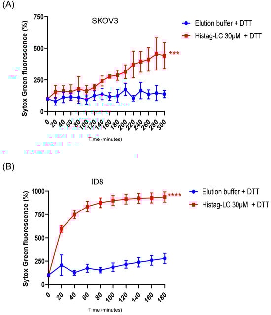 3.7. The Purified Histag-LC Protein from FCV Permeates the Cytoplasmic Membrane of the Human SKOV3 and the Murine ID8 Ovarian Cancer Cells through an Exogenous Interaction
