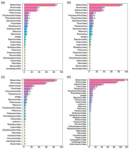 Viromes detected in leafhoppers assigned to different viral families based on the best hits according to BLASTX analysis in RD_LD20200821 (a), RD_LD20201212 (b), NV_LD20210330 (c), and NV_YX20210611 (d).