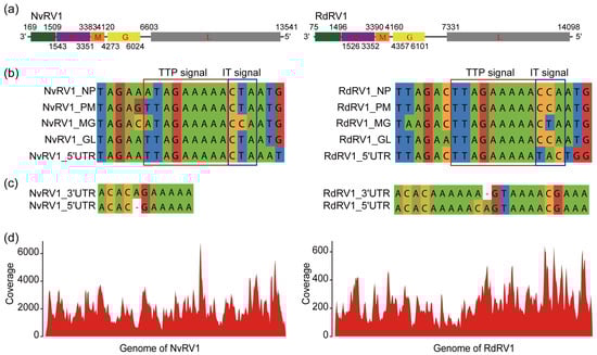 Genome organization of two viruses belonging to the family Rhabdoviridae. (a) Genome organization of NvRV1 and RdRV1 in the negative sense with the order of 3′UTR-N-P-M-G-L-5′UTR. (b) The conserved TTP and IT signals present downstream of the genes in NvRV1 and RdRV1. (c) The complementary sequences of most terminal regions in NvRV1 and RdRV1. (d) RNA-seq mapping showed fluctuating read distributions in viral genomic RNA.