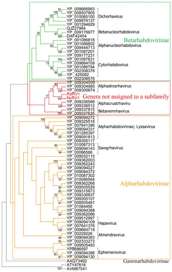 To figure out the detailed classification of NvRV1 and RdRV1, phylogenetic analysis based on the full lengths of L protein sequences was performed with representative members of the family Rhabdoviridae based on the ICTV. The evolutionary model was selected for inferring maximum likelihood trees, according to the lowest Bayesian information criterion. The phylogenetic tree suggested NvRV1 and RdRV1 were in the cluster with species belonging to the genera not assigned to a subfamily (Figure 3). Pairwise sequence identities showed low sequence identities (lower than 60%) in both the genomic sequences and aa sequences of L proteins between RdRV1 or NvRV1 and other individual viruses. Based on the general demarcation criterion for establishing a new species in the family Rhabdoviridae, which required a minimum amino acid sequence divergence of 10% in the L proteins, our results suggested that NvRV1 and RdRV1 are two novel viruses in the genera that are not assigned to a subfamily in the family Rhabdoviridae.
