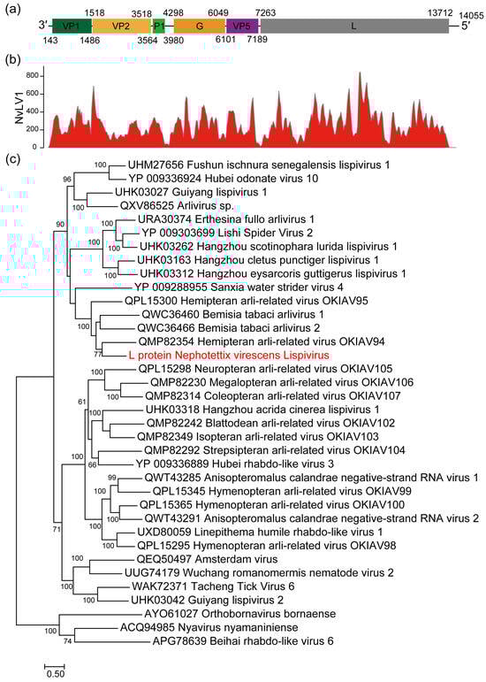 Classic viruses belonging to the family Lispiviridae contain a single-stranded negative-sense RNA genome. In this project, a contig consisting of 13,824 nt from NC_YX20210611 shared 31.41% identity with the RdRP protein of Sanxia water strider virus 4 (family Lispiviridae) in the Viral RefSeq database. The genome sequence of this candidate virus was obtained via RACE. The full-length genome of this virus is 14,055 nt and was tentatively named Nephotettix virescens lispivirus 1 (NvLV1, deposited in Genbank under accession number OP614930). The genome of NvLV1 has a 142 nt 3′ leader region and a 343 nt 5′ trailer region. The negative-sense genome contains six predicted ORFs in the order 3′UTR-VP1-VP2-P-G-VP5-L-5′UTR (Figure 4a), with the 13 nt terminal-most nucleotides of NvLV1 exhibiting 100% reverse complementarity (Figure S2a). In the non-transcribed regions, a conserved transcription termination signal (3′TTTATAAAAA5′) and intergenic trinucleotides (3′GAC5′) were found, followed by a putative transcription initiation sequence (3′GAGAG5′) (Figure S2b). No signal was detected in the intergenic region between VP5 and the L protein.
