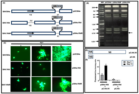 To confirm if protein VII is essential for viral replication, we performed a complementation assay as described [28]. VIDO DT1 cells in 6-well plates were co-transfected in triplicates with plasmid p304a.VIId + pC.HA.VII DNAs or plasmid p304a.VIId + pC.HA DNAs (Figure 1A,D). The transfected cells were observed under a fluorescent microscope daily for the appearance of fluorescent-focus-forming units. VIDO DT1 cells co-transfected with plasmid p304a.VIId + pC.HA DNAs did not show an increase in the number of FFUs from day 5 to day 11 post transfection. In contrast, VIDO DT1 cells co-transfected with plasmid p304a.VIId + pC.HA.VII DNA resulted in an increase in the number of FFUs from day 5 to day 11 post transfection (Figure 1E).