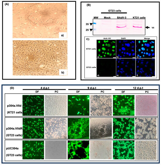 Isolation of protein VII-deleted BAdV-3 (BAV.VIId+). (A). GT23 cell line. Fetal bovine retina cells were transformed with replication-defected lentiviruses expressing bovine Tert gene and SV40 large T antigen, as described in Materials and Methods. Objective 10×. (A) Morphology of untransformed (panel a) and transformed (panel b) fetal bovine retina cells. (B,C). Analysis of KT21 cells. (B). Proteins from cell lysates of GT23 cells, BAdV-3-infected GT23 cells or KT21 cells were separated by SDS PAGE, transferred to nitrocellulose and analyzed by Western blot using anti-VII sera. The molecular weight markers are shown on the left of the panel. (C). Monolayers of indicated cells were fixed with 3.7% paraformaldehyde and the expression of protein VII was visualized by indirect immunofluorescence using anti-VII sera using confocal microscope. The nuclei were stained by DAPI. Scale bars are shown as white lines (D). The monolayers of GT23 or KT21 cells were transfected with indicated plasmid DNAs and visualized for the development of cytopathic effects and expression of EYFP. The numbers on the top depict the days post transfection (d.p.t). DF (direct fluorescence); PC (Phase contrast). Objective 10× (magnification).