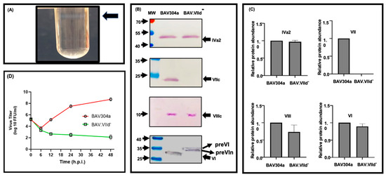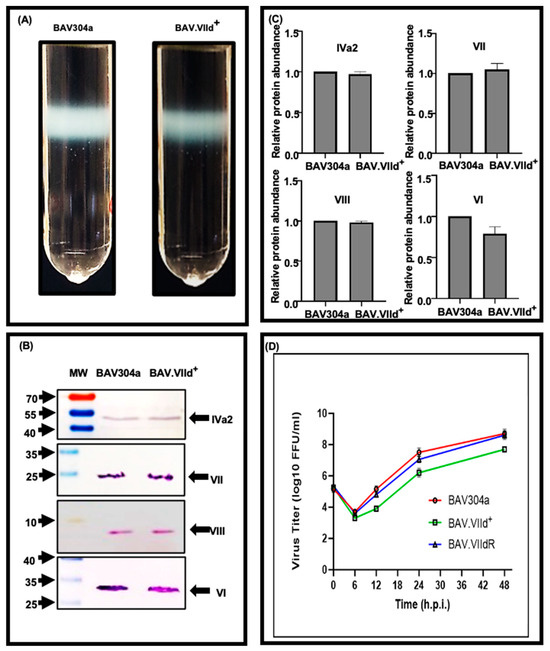 Analysis of BAV.VIId+. (A). CsCl gradient purification. Virus was purified from lysates of infected cells using CsCl density gradient purification. Mature virion bands are shown after double density gradient purification. (B). Western blot. The proteins from purified BAV304a and BAV.VIId+ were separated by SDS-PAGE gels, transferred to nitrocellulose and analyzed by Western blot using protein-specific sera. The molecular weight markers are shown on the left of the panel. The names of the proteins are shown on the right of the panel. (C). The values of panel (B) were analyzed by GraphPad Prism, version 10.1.1 (323) (GraphPad Software, Inc., La Jolla, CA, USA). The values represent the mean of two independent experiments and error bars indicate SD. (D). Virus titer. The KT21 cells infected with indicated viruses were harvested at different times post infection, freeze–thawed three times and used to determine the titer by fluorescent foci assay. h.p.i (hours post infection).