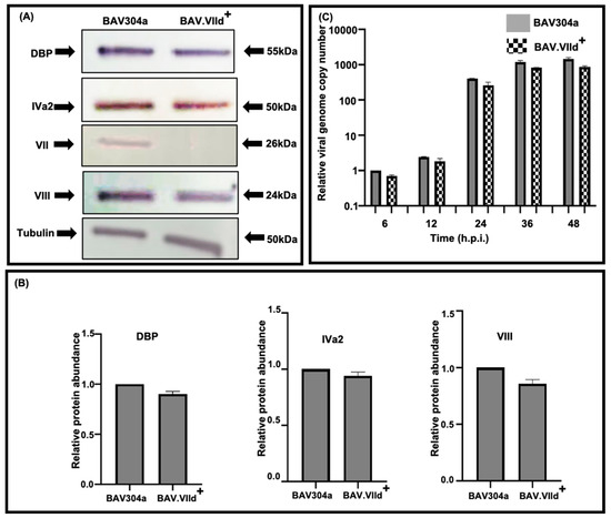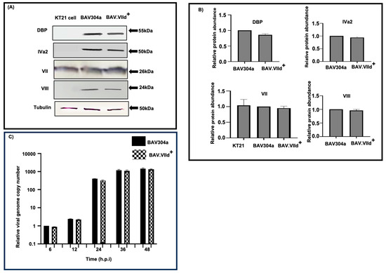 To determine the expression of viral proteins, monolayers of KT21 were infected with BAV304a or BAV.VIId+ at MOI of 2. At 48 h post infection, the cell lysates were analyzed by W estern blotting using protein-specific anti-sera. As seen in Figure 4 (panels A,B), there appears no significant difference in the expression of early (DNA-binding protein [DBP]), intermediate (protein IVa2) or late (protein VII and protein VIII) proteins in KT21 cells infected with BAV304a or BAV.VIId+.