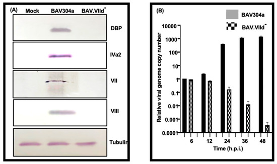 To determine the expression of viral proteins, monolayers of GT23 were infected with BAV304a or BAV.VIId- at MOI of 2. At 48 h post infection, the cell lysates were analyzed by Western blotting using protein-specific anti-sera. As expected, early (DBP), intermediate (IVa2) and late (VII, VIII) protein-specific bands could be detected in BAV304a-infected GT23 cells (Figure 7A). In contrast, no such bands could be observed in GT23 cells infected with BAV.VIId- (Figure 7A).