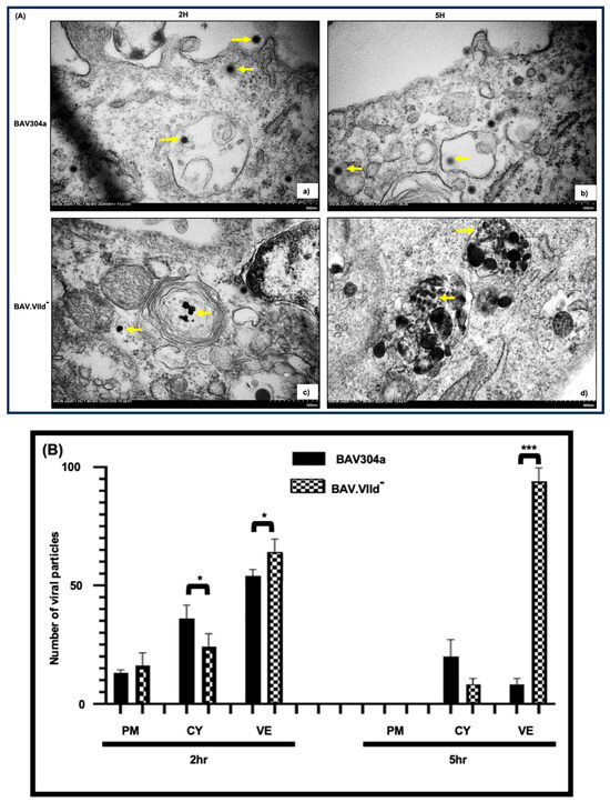 Since infection of GT23 cells with BAV.VIId--detected no viral protein expression or viral DNA replication (Figure 7), we determined the localization of BAV.VIId- in GT23 cells by TEM. The GT23 cells were infected with an equal amount of Cscl-purified BAV304a or BAV.VIId- virus particles for 1 h at 4 °C. The cells were further incubated at 37 °C for 1 h or 4 h before being analyzed by TEM. As seen in Figure 9A, protein VII-deleted BAV.VIId- virions (panels c,d) were significantly clustered in the cytoplasmic vesicles compared to BAV304a virus-infected (panels a,b) cells. The number of particles at plasma membrane, cytoplasm or vesicles/endosomes are depicted (Figure 9B).
