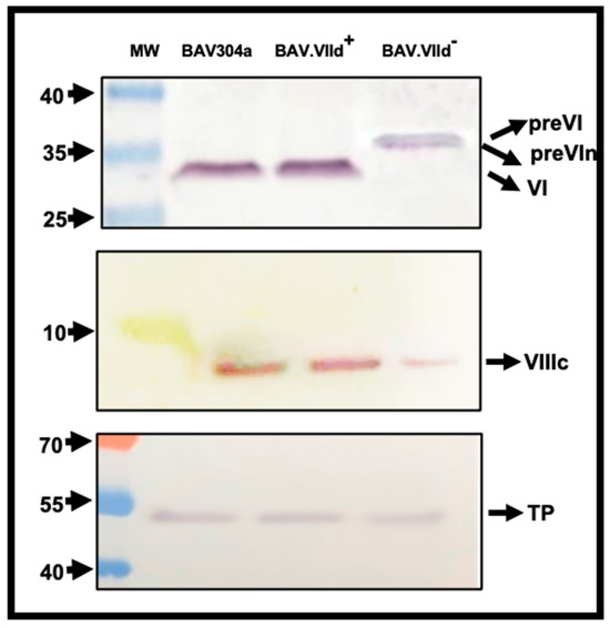 Protease cleavage of BAdV-3 proteins. The proteins from purified BAV304a, BAV.VIId+ and BAV.VIId- were separated by SDS-PAGE gels, transferred to nitrocellulose and analyzed by Western blot using protein-specific sera. The molecular weight markers are shown on the left of the panel. The name of the proteins is shown on the right of the panel.