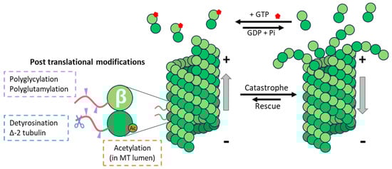 Microtubule dynamics and tubulin post-translational modifications. MTs’ (+) end undergoes dynamic polymerization, with the addition of new αβ-GTP (in red) tubulin dimers, and depolymerization. The presence of certain post-translational modifications of α- and or β-tubulin is associated with stable microtubules that are more resistant to mechanical stress and catastrophe events.