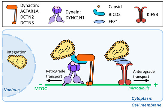 HIV-1 viral cores use MTs to reach the nucleus. HIV-1 cores have been reported to load both on dynein and kinesin complexes and to move in a bidirectional manner along MTs. The dynein adapter BICD2 binds directly to the Capsid protein, and the other different members of the complex involved in this retrograde transport are highlighted at the top of the graphic. For the anterograde counterpart, FEZ1 seems to mediate the direct interaction with the viral core.