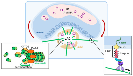 During infection, vACs promote the expression and recruitment of different +TIPs to enable microtubule nucleation [36,37]. Indeed, forty-eight hours post-infection, the EB-independent +TIP-transforming acidic coiled-coil protein 3 (TACC3) mRNA expression levels are increased, and the protein is later recruited to the vAC. In turn, TACC3 recruits the colonic and hepatic tumor overexpressed gene (chTOG), a protein involved in microtubule dynamics and spindle formation, overall promoting microtubule growth [36]. This virus-induced phenomenon leads to a physical rotation of the nucleus associated with the accrued accumulation of viral DNA in RCs. This virus-induced nucleus rotation involves the Linker of nucleo-skeleton and cytoskeleton (LINC) proteins Sun1 and Nesprin through an interaction with the dynein/BICD2 complex. Inside the nucleus, these external forces create intranuclear polarity, segregating viral DNA from host DNA [38] and promoting viral transcription (Figure 3). In this case, MT reorganization governs the connection between vAC present in the cytoplasm and nuclear RC by controlling the transcriptional activity and increasing the production of viral proteins that feed the vAC.