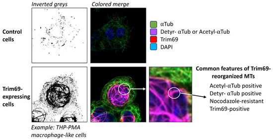 The TRIM family is composed of approximately 80 members in humans. Most of them can heterodimerize or homodimerize and thus can influence each other in numerous ways that can span stability, localization, and the capacity to organize in higher-order structures. One level of regulation of this capacity occurs at the level of expression with some TRIM proteins that are expressed constitutively in certain tissues, or only after specific stimulation of which interferon is the most studied, but likely not the only one, as is the case for TRIM67/TNL. This complexification is a caveat of most, if not all, studies on TRIM proteins that make the abstraction of the possibility that several TRIM members may modulate the activity of the TRIM protein studied. However, this simplification is needed not only because of the extremely high number of combinations that should be tested but also because several TRIM members are expressed in multiple isoforms. Currently, aside from TRIM69, the antiviral potential of the TRIM members endowed with MT-binding properties has not been explored to its full extent. Certain studies have highlighted the possibility that this may be the case (Figure 7), although the true weight that MT reorganization may play remains unclear. With this section, it is our hope that this evidence will raise new interest in the connections between TRIM-MAPs and antiviral responses and inspire much-needed studies in this area.