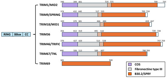 Contrary to TRIM69, which belongs to the C-IV TRIM subfamily, all the TRIM members known to interact with MTs belong to the C-I subfamily. The first description of a member of the TRIM family as being associated with microtubules dates back from the late 1990s with the identification of TRIM18 (Midline 1, MID1) and TRIM1 (Midline 2, MID2) as MT-binding proteins [65,66,67,68,69]. Later, following bioinformatics approaches, Short and Cox identified a novel domain through which several additional TRIM members could associate with MTs [70]. This motif was referred to as the C-terminal-subgroup-one signature (COS), as it was identified in several members of the C-I TRIM subfamily (out of IX subfamilies overall) (Figure 6). The COS domain is a loosely conserved motif spanning 60 amino acids that is posited after the coiled-coil domain present on all TRIM proteins, and it can be functionally transferred to heterologous TRIM proteins, conferring MT-binding activities. As mentioned above, our laboratory has recently identified TRIM69 as an MT-binding protein, and interestingly, TRIM69 does not possess a detectable COS domain [62]. Therefore, this finding strongly argues for additional domains through which TRIM members can associate with MTs.