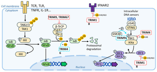Several TRIM-MAPs intersect directly with the interferon-signaling pathway. For instance, TRIM18/MID1 has been shown to degrade the type-I interferon receptor 2 [139], as well as the interferon regulatory factor 3 (IRF3, [140]), while TRIM46/TRIFIC leads to decreased IFN responses by interacting with the TANK-Binding Kinase 1 (TBK1, [141]). To strengthen a potential link with inflammatory responses, several TRIM-MAPs exert regulatory and often opposite effects over the nuclear factor kappa-light-chain-enhancer of activated B cells’ (NF-κB) signaling pathway, which, of course, occupies key roles in inflammatory responses’ regulation. For example, TRIM46/TRIFIC promotes the ubiquitination and degradation of the NF-κB inhibitor IκBα, leading to the activation of the NF-κB signaling pathway [142]. In contrast, TRIM9/SPRING and TRIM67/TNL exert an opposite effect on this pathway by displacing the β-transducin repeat-containing protein (β-TrCP) from the Skp-Cullin-F-box ubiquitin–ligase complex. This results in an inhibition of IκBα degradation, driving dampened proinflammatory responses [143,144,145,146,147]. To complexify the matter, alternative isoforms that are often observed in the case of TRIM genes may exert distinct regulatory functions. This has been proven in the case of TRIM9/SPRING, in which a short isoform (TRIM9s) positively regulates type I IFN signaling by activating IRF3 signaling [148,149], thus exerting global effects opposite to the ones of the full-length protein.