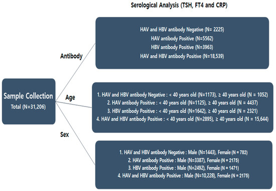 A subset of the participants (N = 30,289) underwent testing for HAV and HBV antibodies (Figure 1). The participants were stratified according to their HAV and HBV antibody status into antibody-positive and antibody-negative groups. To prevent potential cross-reactivity issues, we ensured there was no overlap of antibodies between these groups; for example, participants with HAV antibodies did not have HBV antibodies and vice versa. All participants were specifically chosen to be negative for HBV surface antigens (HBsAgs) to eliminate any potential interactions with the antigens. The participants were further categorized into distinct groups based on other clinical criteria, such as age, sex, and infection outcome. This systematic classification facilitated the examination of potential associations between HAV/HBV infection status and relevant variables. Participants with missing values for TSH, FT4, and CRP were excluded.