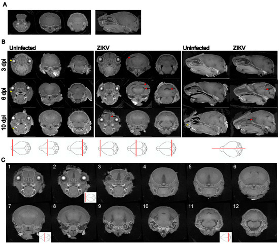 The molecular basis for CZS has been informed by many studies demonstrating ZIKV infection and cell killing of neural progenitor cells in vitro and in vivo [22,23,24,25]. Studies also suggest that, in addition to neurones, astrocytes and microglia are susceptible to infection and viral induction of cell death and contribute to ZIKV-induced brain pathology [22,26,27]. Additionally, mouse models of ZIKV infection during pregnancy demonstrate dramatic effects on the brain, such as reduction in overall size, but often utilise immunodeficient mice, such as those lacking the interferon response, with subsequent severe brain impact and foetal demise [28]. This may reflect aspects of ZIKV infection in utero associated with foetal loss in humans, but, importantly, many babies that are exposed to ZIKV in utero ultimately survive, with varying degrees of impairment at birth and evolving neurological impact [9,15]. Immunocompetent mouse models of direct brain infection of the embryo are established and also demonstrate impact on the brain, measured by both 2D image analysis and histology, such as areas of necrosis and cellular infiltrates in the cortex, hippocampus, thalamus, and cerebellum at 21 days postnatally [25]. Immunocompetent mouse models of early postnatal (P1-P3) ZIKV infection result in acute ZIKV replication and inflammation 3–6 days post-infection (dpi) [29] and demonstrate infection of the retina [30], as well as diverse cell types and regions of the brain. This includes astrocytes and neurones, with infection of the hippocampus and cerebral cortex having the highest infected cell numbers in the cortex [31]. There are subsequent morphological changes in the brain that are consistent with the pathology in humans, including calcifications and ventriculomegaly [22,32,33,34]. These changes have been characterised both histologically and by MRI late in the course of disease in mice (e.g., 21–30 dpi and into adulthood) and can be associated with ongoing inflammation, cell death, and reduced volume of the total brain assessed dorsally by gross morphology [22,35]. Our laboratory has used a similar postnatal ZIKV-infection model in immunocompetent mice [29] and tested the applicability of a relatively new research tool, diffusible iodine-based contrast-enhanced computed tomography (diceCT), to undertake a three-dimensional (3D) in situ analysis of the early (3–10 day) morphology of the ZIKV-infected mouse brain during development and prior to the onset of overt disease. This time period in development reflects late in utero development of the brain and eye in humans and a period of rapid growth of the rodent brain [36,37].
