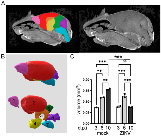 Brain segmentation and quantitation of total brain volumes throughout development in uninfected and ZIKV-infected mice. P1 mice were left uninfected or ZIKV-infected, and, at the time points indicated, whole heads were collected and subjected to diceCT. Images were rendered, brains segmented, and volume quantitated. (A) Sagittal diceCT image with segmented regions of the brain superimposed; (B) segmented brain regions 1 = olfactory bulb, 2 = cerebrum, 3 = hippocampus, 4 = interbrain (thalamus and hypothalamus), 5 = midbrain, 6 = cerebellum, 7 = hindbrain and brain stem; (C) Total brain volume. ** p < 0.01; *** p < 0.001, one-way ANOVA, Tukey’s multiple comparison test, ns = not significant. 3 and 6 dpi (n = 4 mock; n = 2 ZIKV per time point), and 10 dpi (n = 3/group).